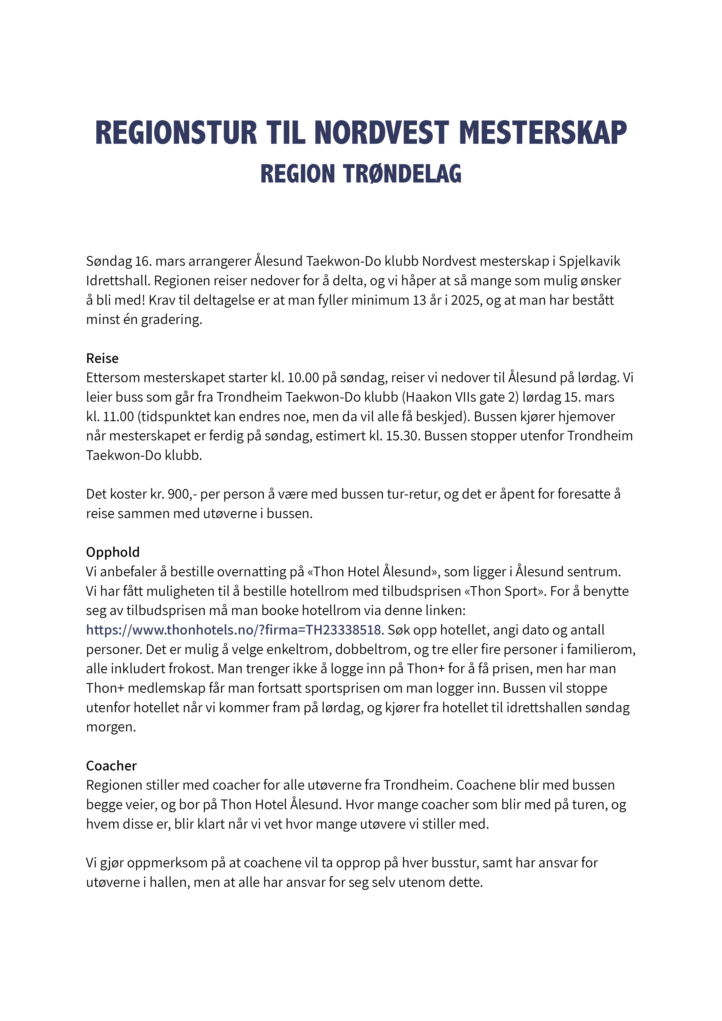 Søndag 16. mars arrangerer Ålesund Taekwon-Do klubb Nordvest mesterskap i Spjelkavik Idrettshall. Regionen reiser nedover for å delta, og vi håper at så mange som mulig ønsker å bli med!